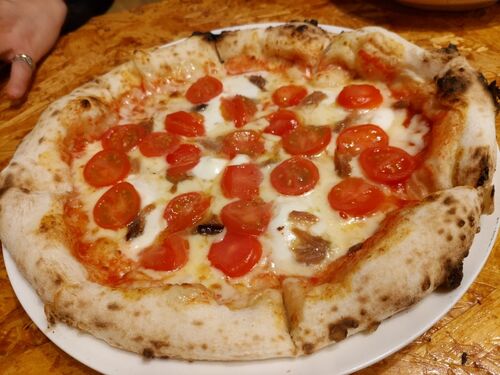 日本三景天橋立を望む丘の上にあるログハウスで窯焼きピザをいただきました✨ グランピング施設やリゾートホテルなどが並ぶエリアにお店はあります✨ 店内はログハウス独特の太く大きな木材 圧倒されます メニューはシンプルです(^_^) お肉系のガッツリピザと…