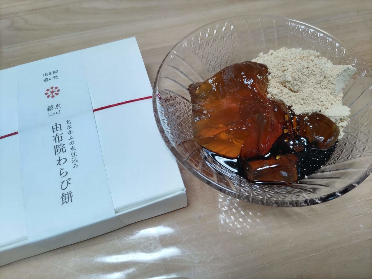 地下から湧き出る美しい名水「ゆふの水」と国産素材を使用し作られるわらび餅...おとりよせのランキングで常に上位に顔を出す有名なお店です(^^)